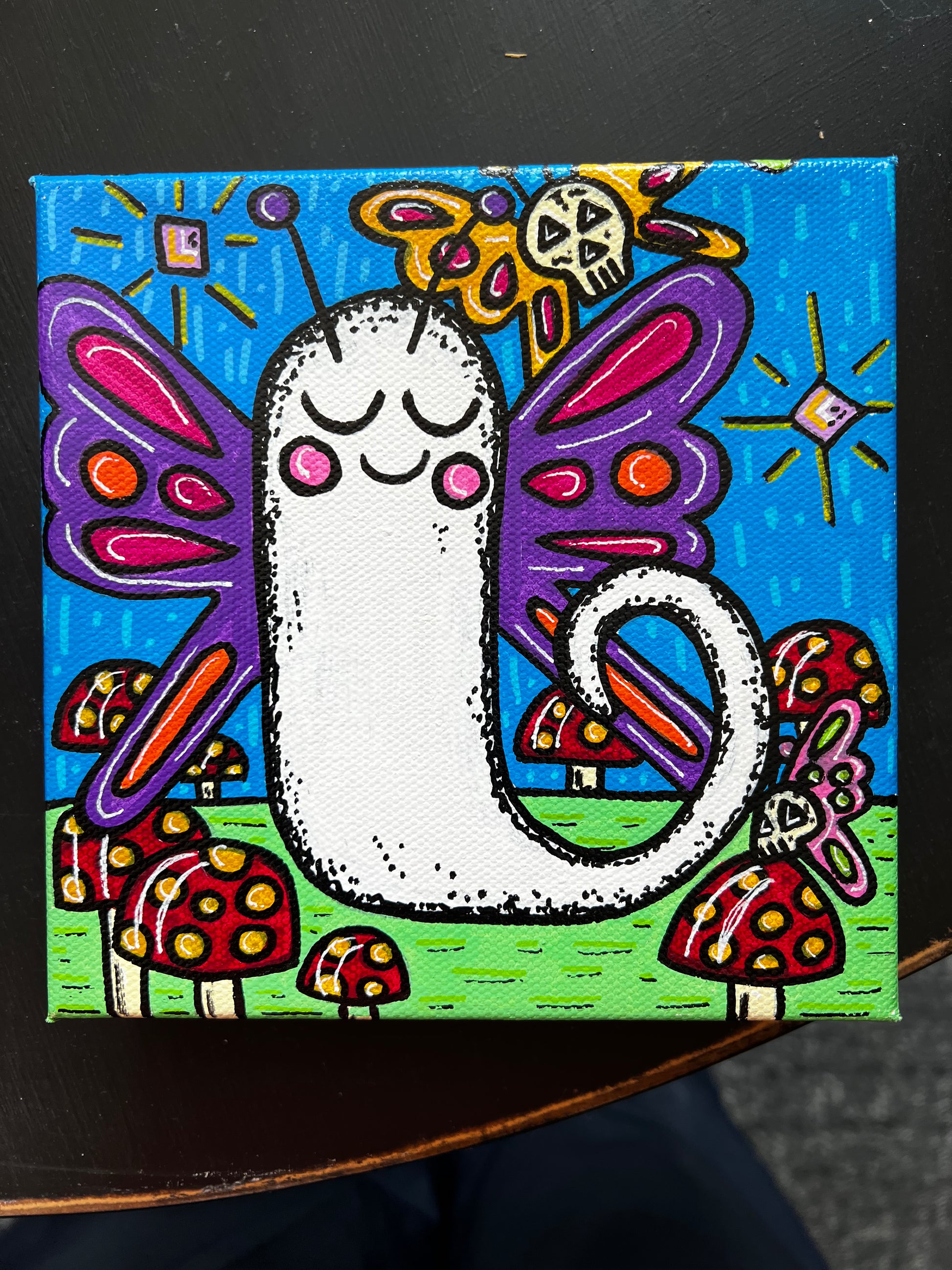Our favorite ghost has wings and is surrounded by his skutterfly friends! In this 5x5x2 acrylic painting, the ghost is taking flight with his new friends. Good on a shelf or hanging on the wall, this new piece of art is a must for your butterfly lovers!