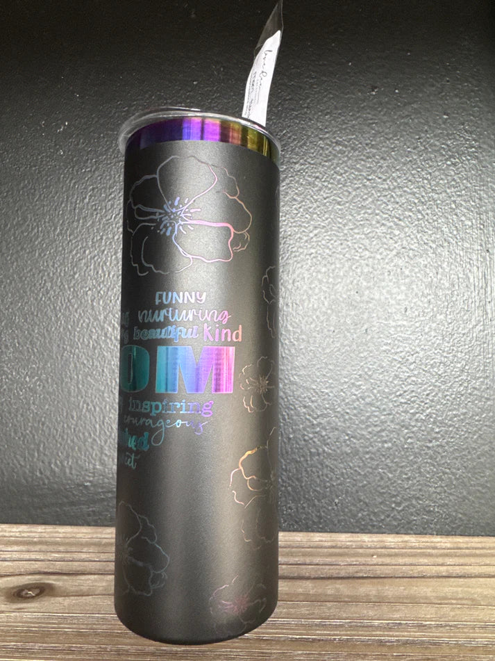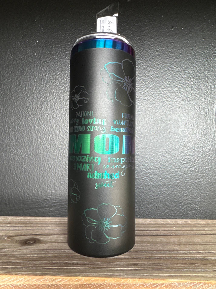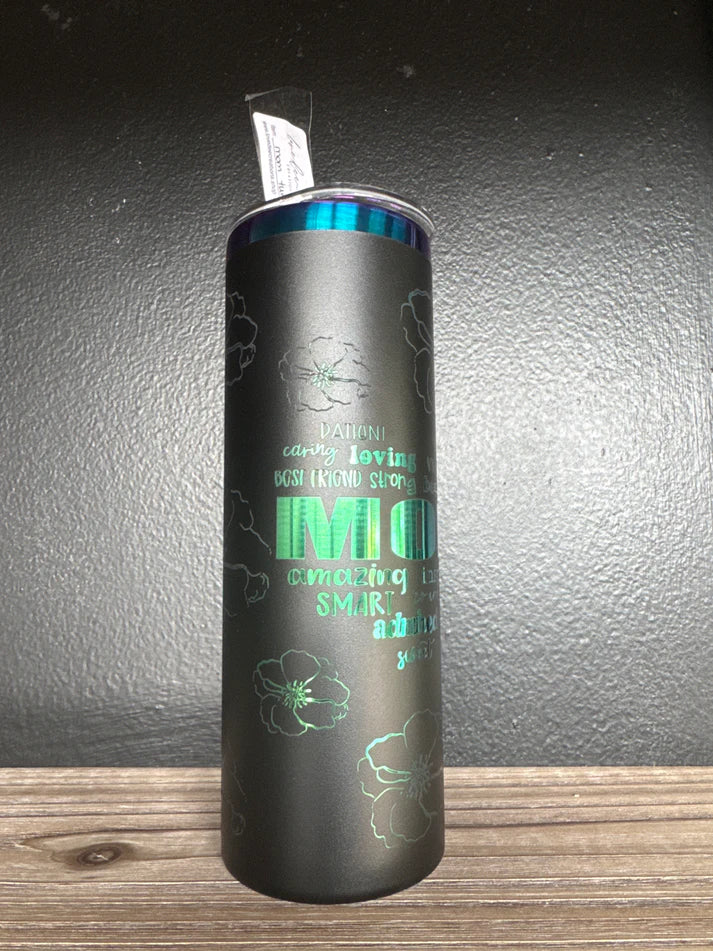 A 24 oz tumbler with laser engraved images of a mother, positive affirmations, and delicate flowers.