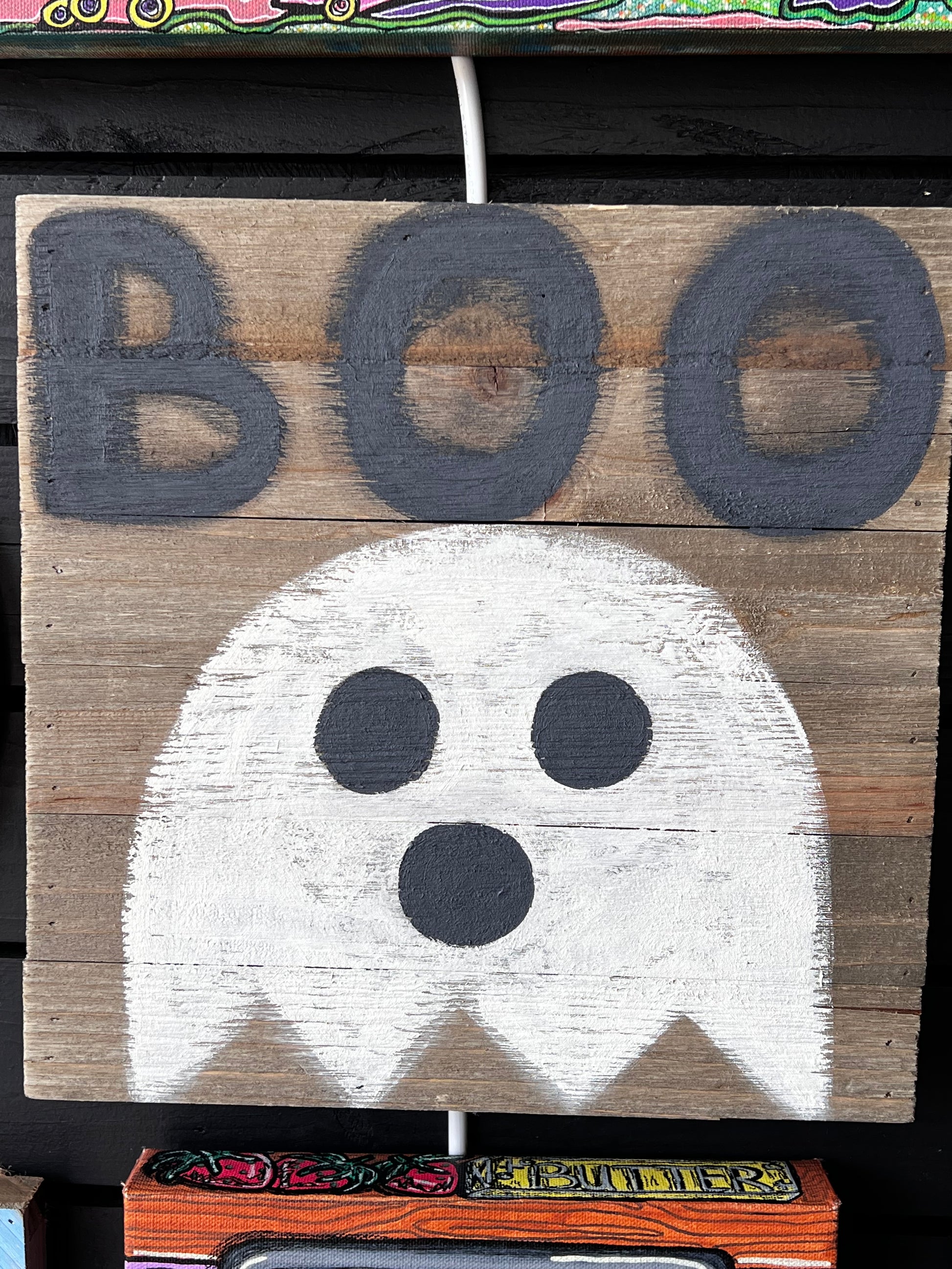 A cute sign, perfect for indoor spaces! Great in an office, by an entry door, or hanging on a covered porch. A simple design sure to complement your decor and please your Halloween guests. 12”x12” distressed Wood Sign.