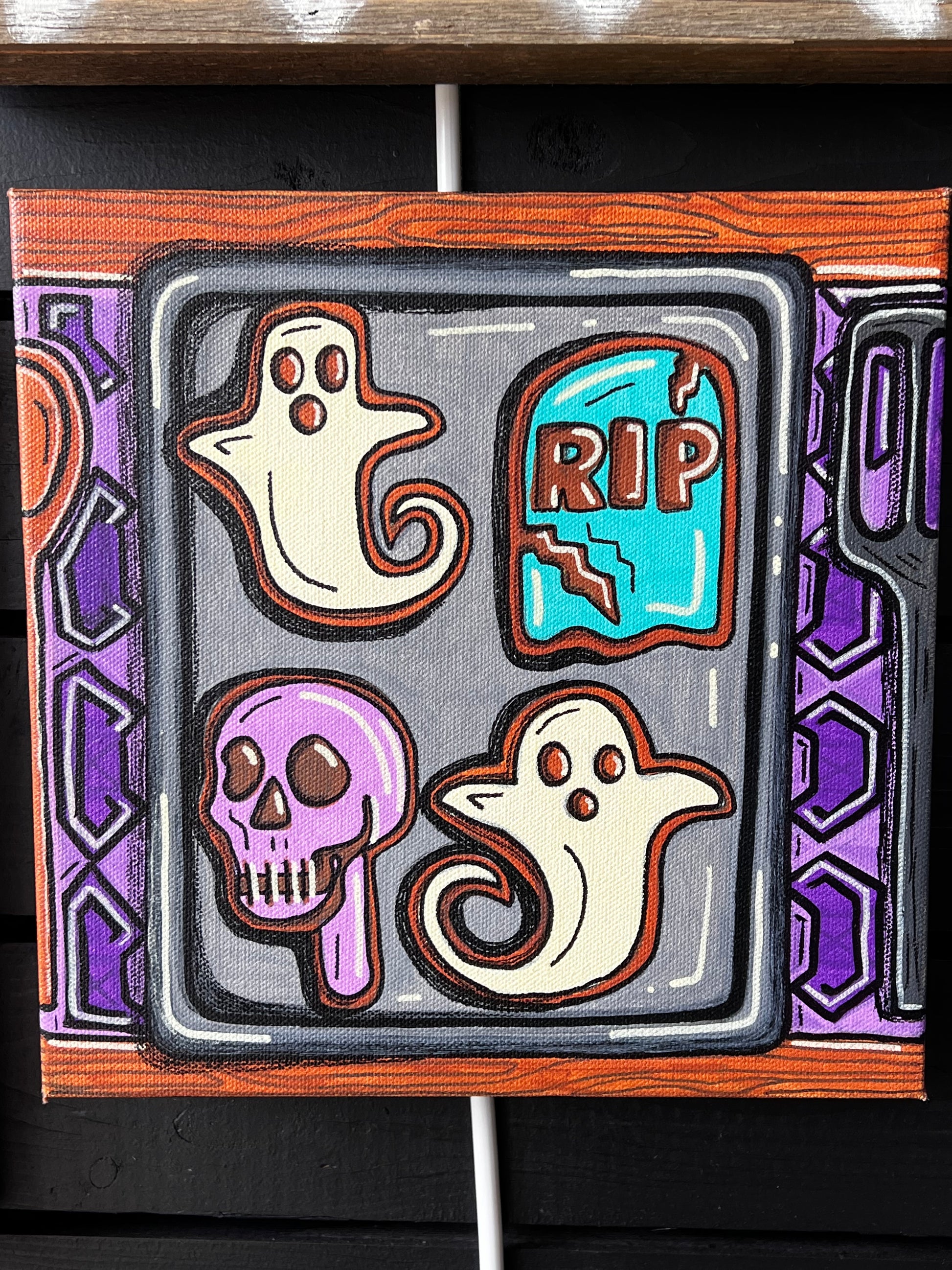 Spirits baking their favorite cookies for the holiday in this 8”x8”x2” painting. Good on a shelf or hanging on the wall, this new piece of art is a must for your collector.
