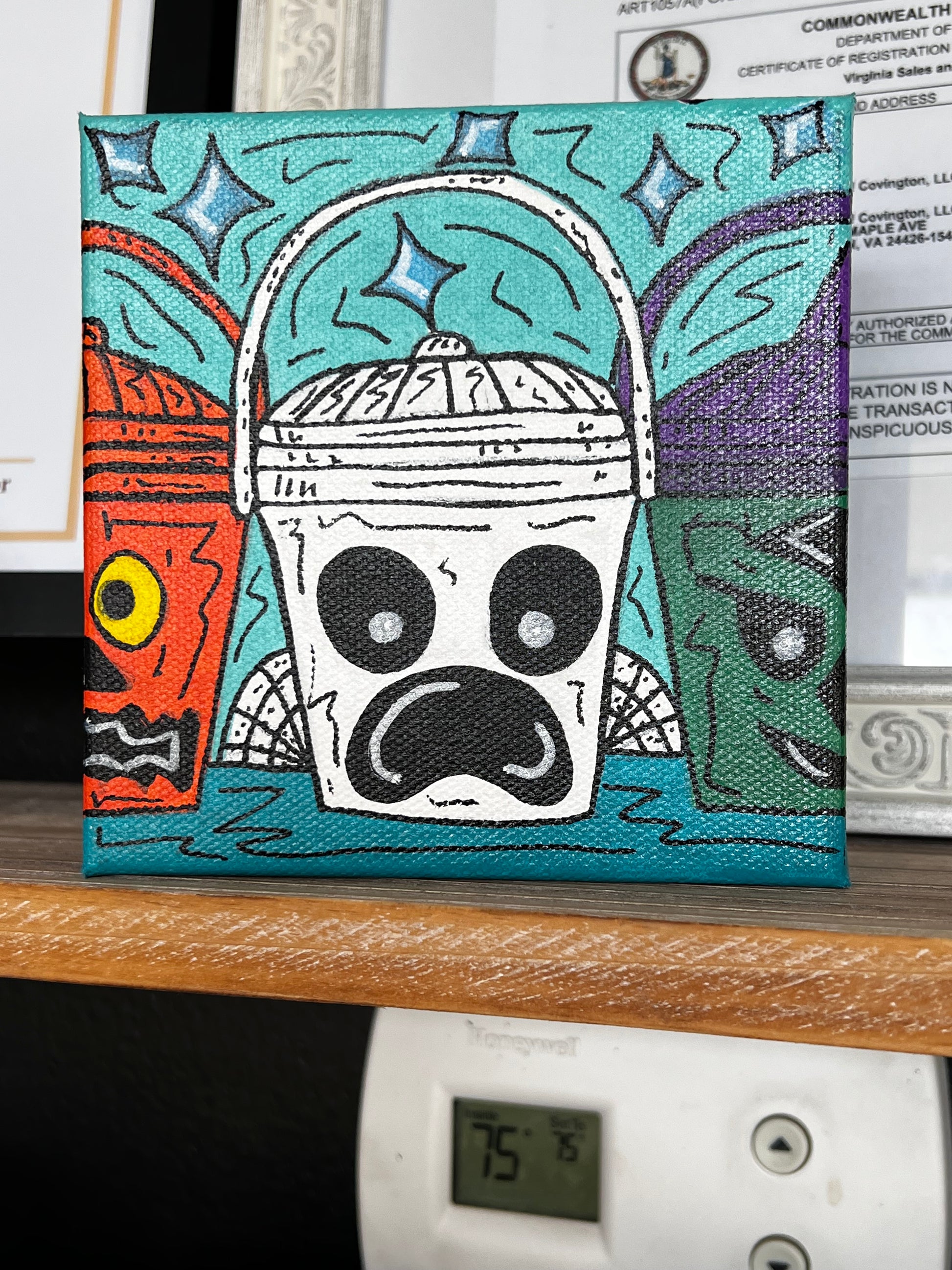 Our favorite childhood memories can be found within a bucket in this 4x4x2 acrylic painting. Good on a shelf or hanging on the wall, this new piece of art is a must for collectors.
